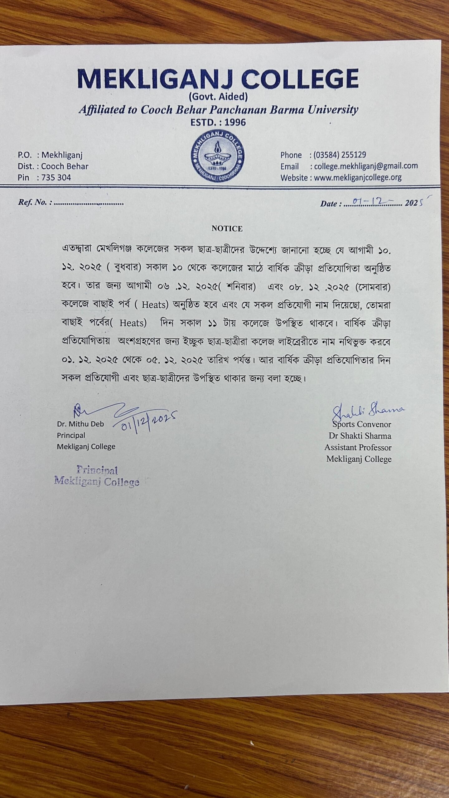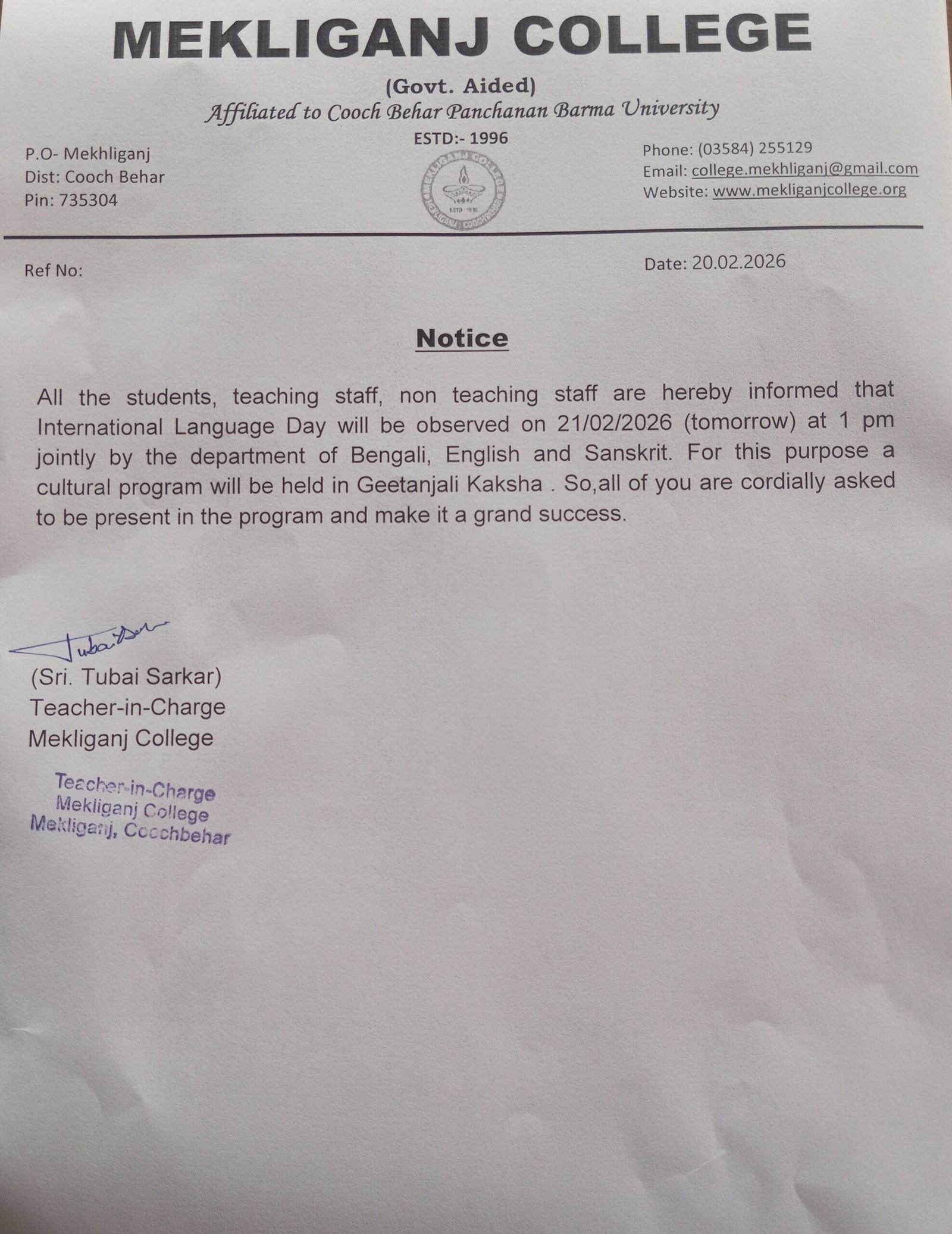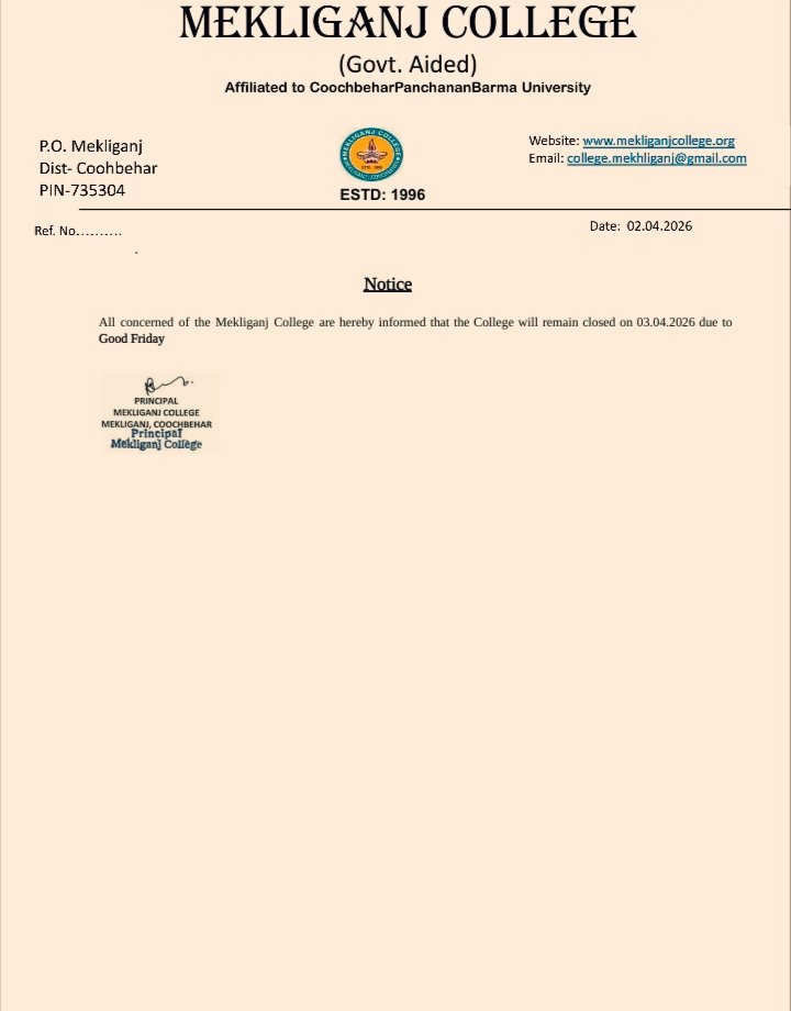 Mekliganj College, founded on 22nd December, 1996 as a General Degree College in the district of Cooch Behar, West Bengal, is located at the remotest part of the district adjacent to Bangladesh border. After partition, Mekhliganj, once strategically important town, was converted into a backward town from both socio-economic as well as academic perspectives. To overcome this backwardness, the people of Mekhliganj Subdivision, through relentless truffle of almost one decade, were able to establish the college so that local people can get an opportunity to improve their level of knowledge and awareness. From its modest beginning in 1996, the college within a very short period has developed its own distinctive identity by introducing some new disciplines as well as increasing the number of its faculty members. In some cases, external